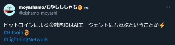 Lightning Labsの人達が、AIエージェントはドルや円などの法定通貨を使う銀行口座開設やクレカ登録ができない、ということに課題を感じている点がおもしろいです。