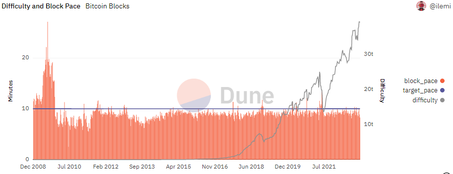 難易度調整によって、ビットコインは10分に1ブロックがマイニングされます。しかしながら、当然毎回ちょうど10分というのはほとんどありません。下記の図を見てわかるように、ブロック時間は10分を下回っていることが多いです。