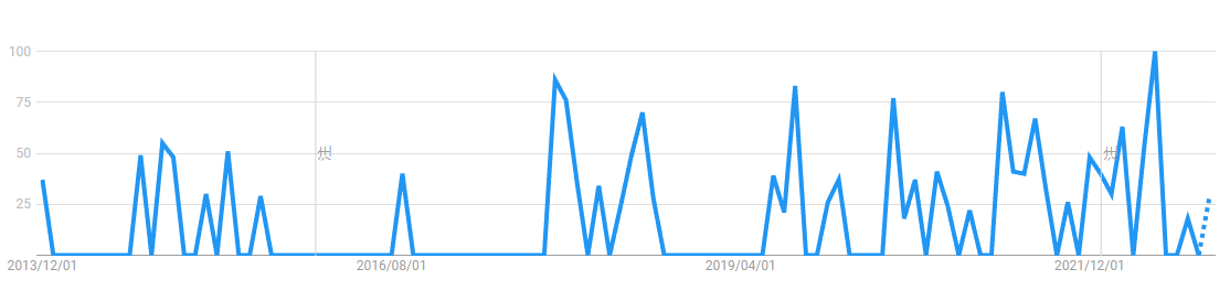 HyperbitcoinizationのGoogleトレンドは下記のグラフです。データとしてまばらですが、市場が盛り上がった2017年、2021年あたりに人も増えて活発化していそうです。