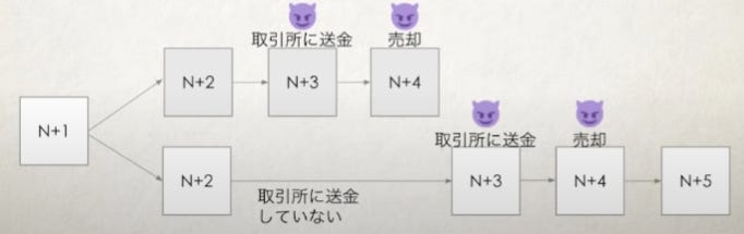 チェーン1で取引所に送金(偽の送金になる)して売却、チェーン2では未送金とすることでBTCを保有したままお金を稼ぐ