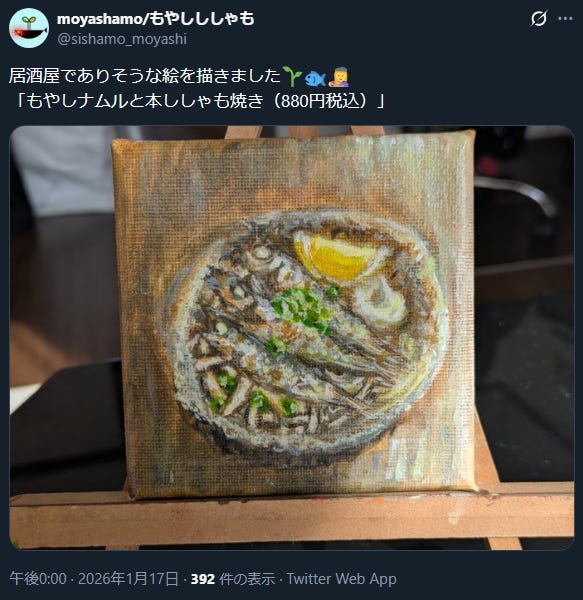 ししゃもともやしの一品の写真をGeminiに依頼して、それを元にアクリル絵の具で描きました。ししゃも(魚)はいい感じにできたけど、もやしがめちゃくちゃ難しかったです。
